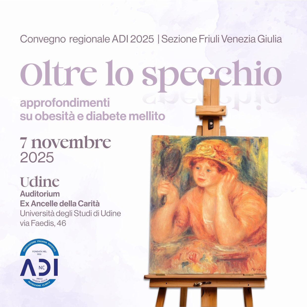 Il 7 novembre 2025 presso l’Auditorium Ex Ancelle della Carità Università degli Studi di Udine, via Faedis, 46 si terrà il Convegno regionale ADI 2025 - Sezione Friuli Venezia Giulia. “Oltre lo Specchio- approfondimenti su obesità e diabete mellito” in cui la nostra socia Paola Sbisà parlerà di Obesità e genere.