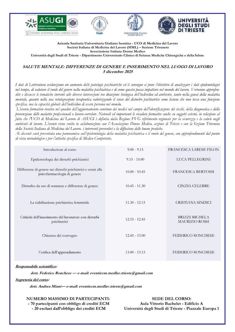 Venerdi 5 dicembre presso l'aula Bachelet dell'Univeristà degli studi di Trieste, a cura di ASUGI, SIML, AIDM e Università degli strudi, si terrà il corso ECM dedicato alle differenze di genere in psichiatria e l'inserimento dei siggetti "fragili" nei luoghi di lavoro