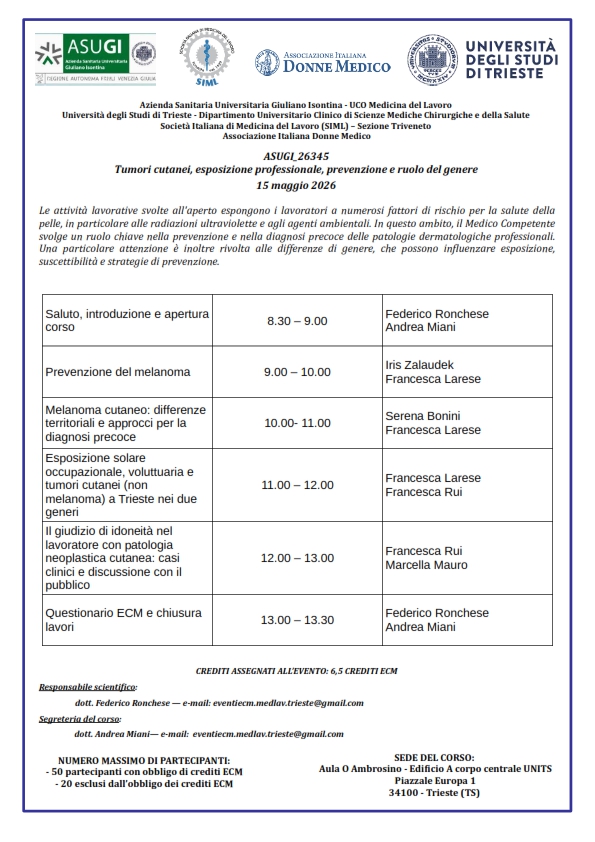 Venerdi 15 maggio presso l'Aula O Ambrosino - Edificio A corpo centrale dell'Univeristà degli studi di Trieste, Piazzale Europa 1, a cura di ASUGI, SIML, AIDM e Università degli strudi, si terrà il corso ECM dedicato ai tumori cutanei. Le attività lavorative svolte all'aperto espongono i lavoratori a numerosi fattori di rischio per la salute della pelle, in particolare alle radiazioni ultraviolette e agli agenti ambientali. In questo ambito, il Medico Competente svolge un ruolo chiave nella prevenzione e nella diagnosi precoce delle patologie dermatologiche professionali. Una particolare attenzione è inoltre rivolta alle differenze di genere, che possono influenzare esposizione, suscettibilità e strategie di prevenzione. Il corso prevede 6,5 crediti ecm